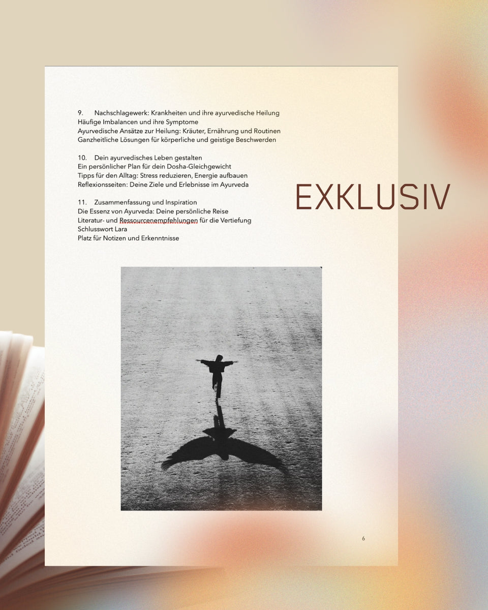 Knapp 200 Seiten gelebte Weisheit, Heilung, Kraft, Empowerment, Rezepte, Inspirationsaufgaben, Journaling, fundiertes Wissen aus Psychologie, Wissenschaft und vor allem, den Lehren des Ayurveda & der Selbstverbindung.