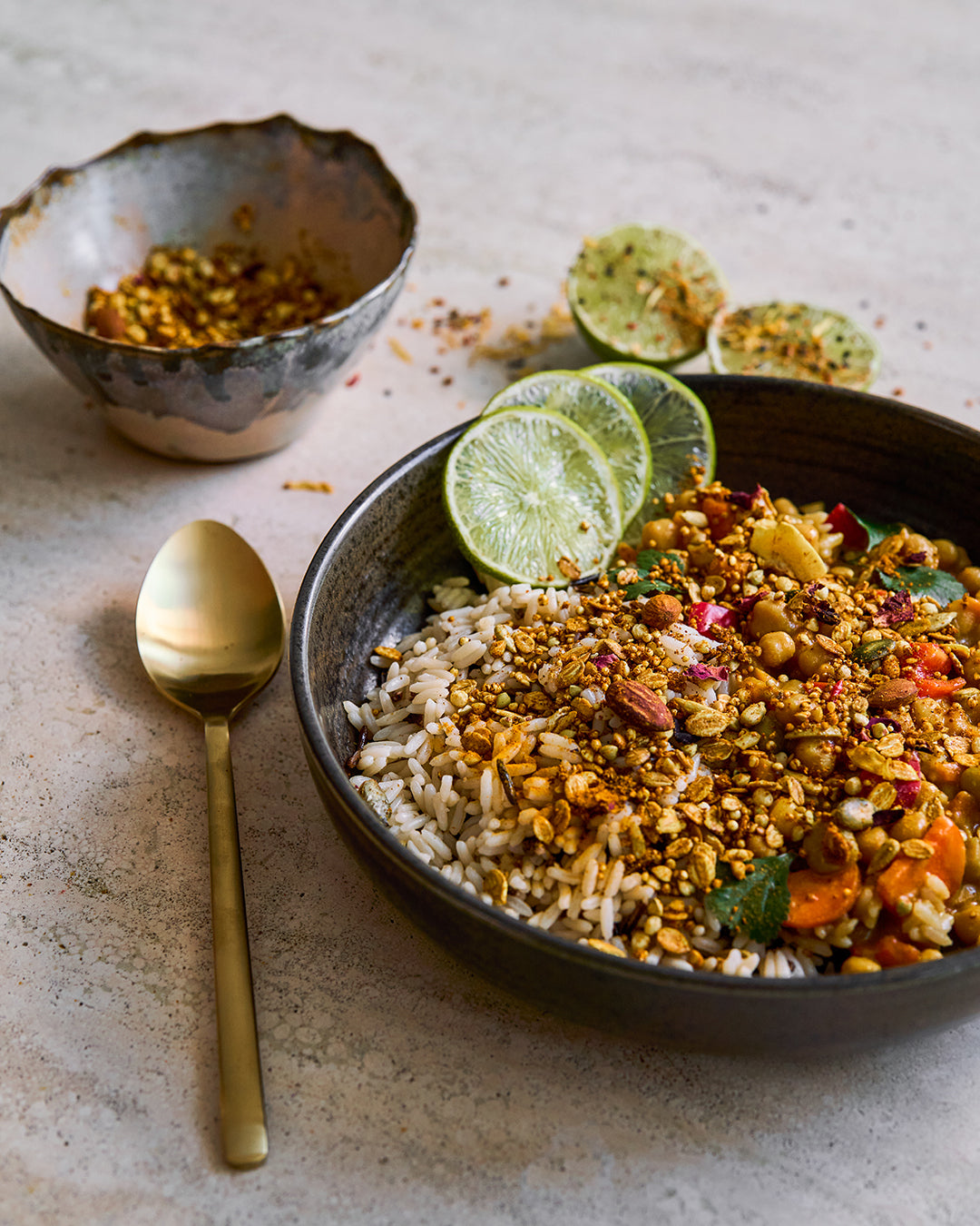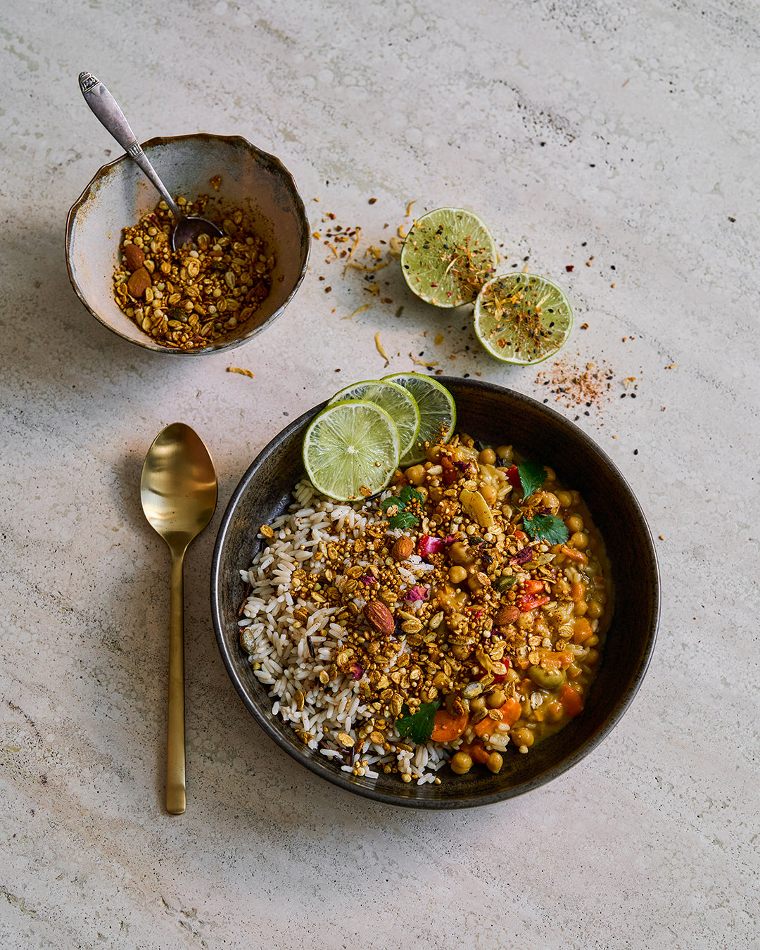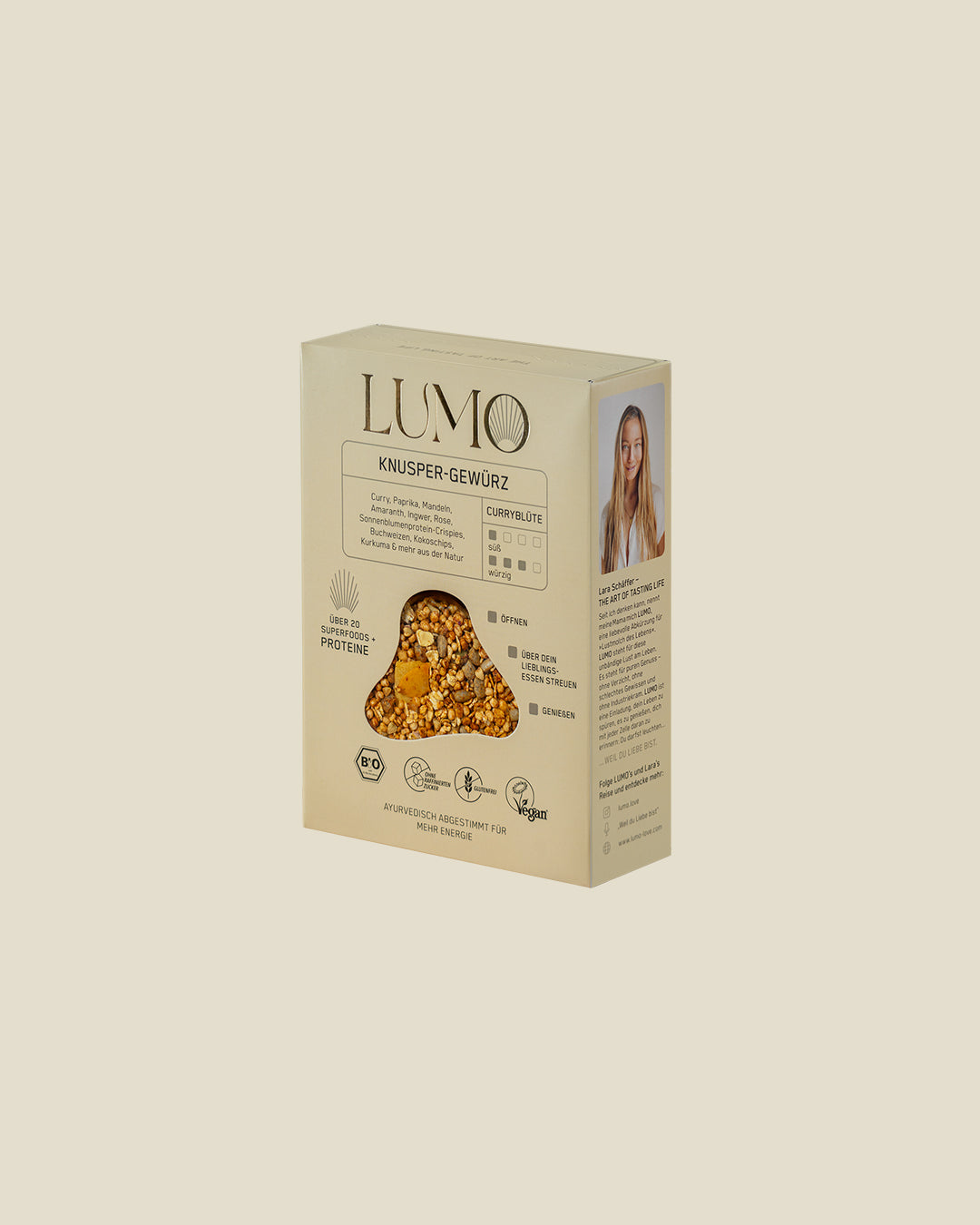 Feinste Gewürzkompositionen aus Kurkuma, Kreuzkümmel, Kardamom, gepuffter Quinoa, Sonnenblumenprotein-Crispies, Amaranth, Hanfsamen, Leinsamen und ayurvedischen Bitterstoffen wirken ausgleichend, nährend und inspirierend.